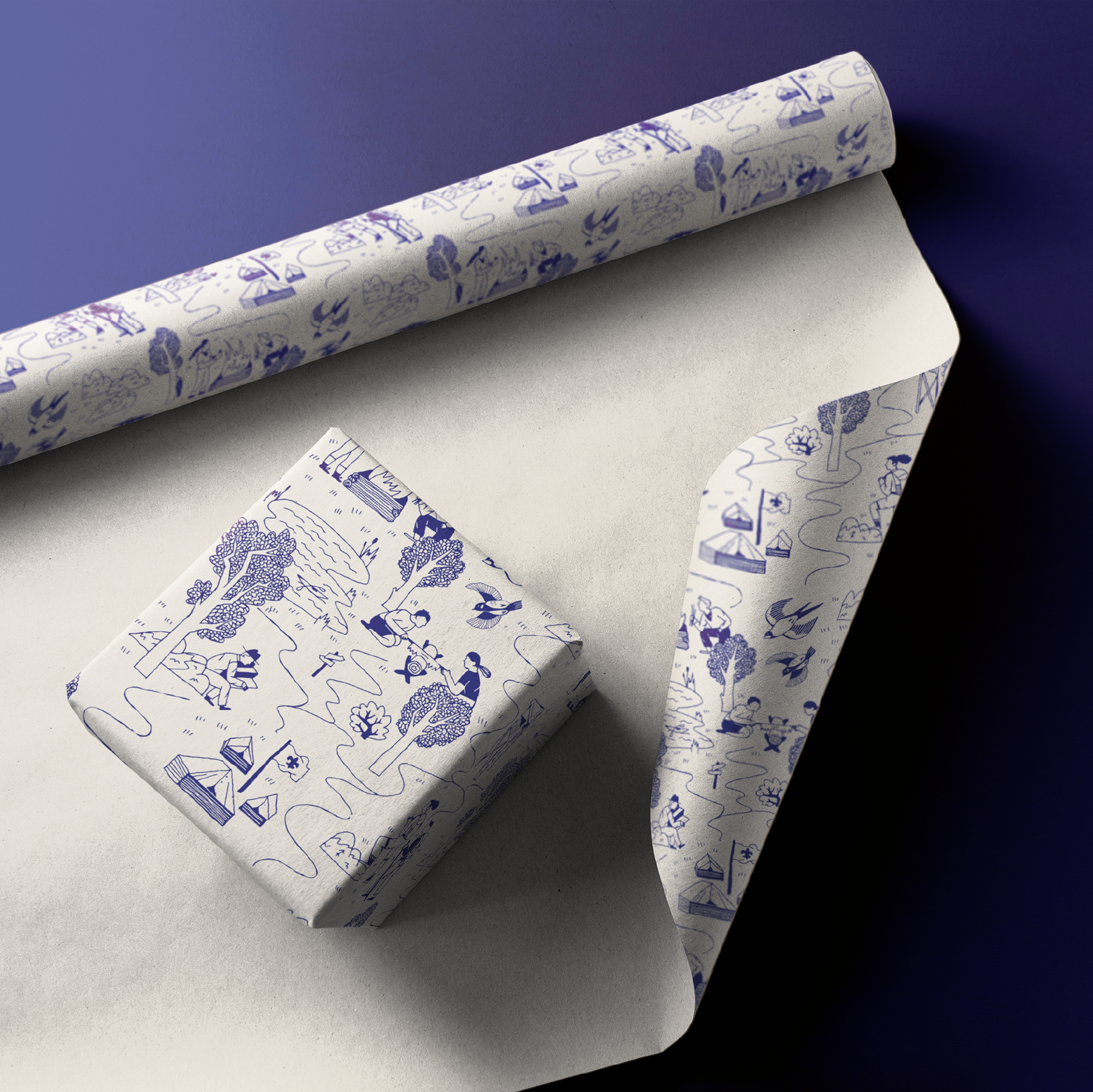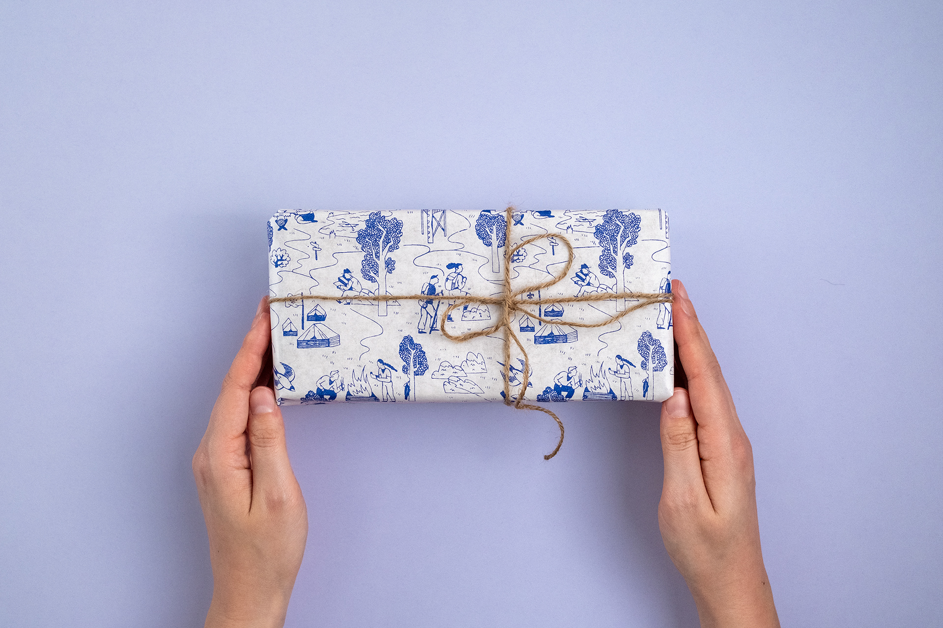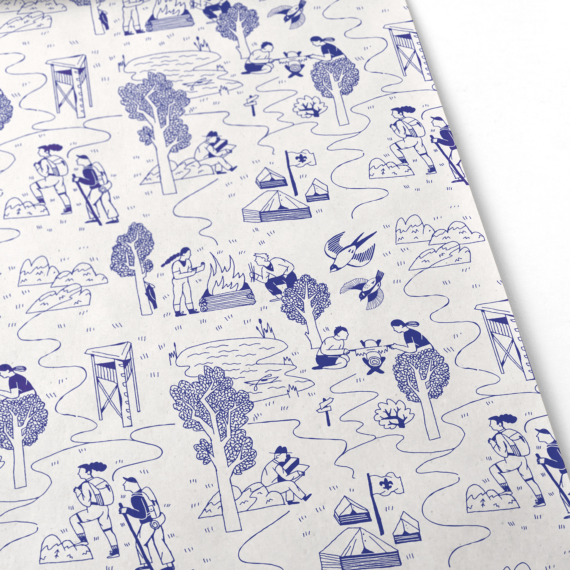 Ilustrace na skautský dárkový balicí papír s tématem cesty přírodou.